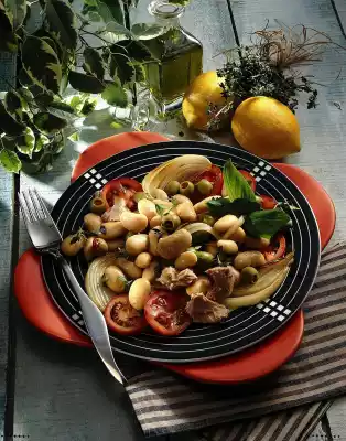 Fold in the remaining oil. Swirl the beans and olives in the salad dressing and arrange on the plates with the onion wedges. Add the tuna. Garnish with remaining thyme and possibly basil.