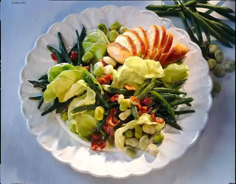 Defrost frozen beans. Press out of the shell as desired. Clean, wash and halve the green beans. Cook the green and broad beans in boiling salted water for about 10 minutes until firm to the bite. Halve the chicken filet, remove sinews and fat and rinse cold.