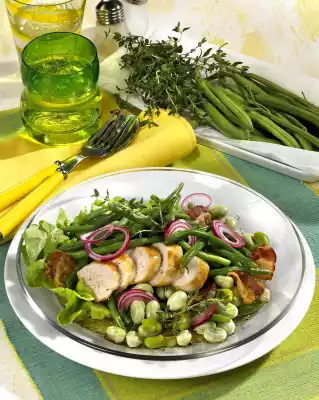 Add onions to the frying fat, deglaze with vinegar, bring to the boil briefly and remove from the heat. Add oil. Season with salt, pepper and sugar. Wash, chop and stir in thyme. Clean the salad, wash it and tear it into pieces. Arrange prepared salad ingredients in portions, sprinkled with sliced chicken fillet and thyme marinade