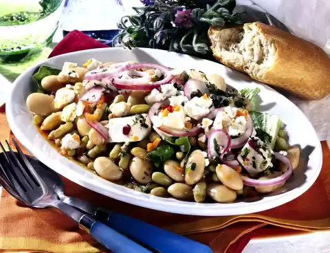 Wash and chop the herbs. Mix 3 tablespoons vinegar, herbs, salt and pepper. Whip the oil into the mixture. Mix chilli, onion rings, lettuce strips and beans with the marinade. Fold in feta cheese. Tastes good with fresh farmhouse bread