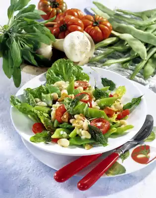 Peel the garlic and cut into slices. Fry in 1-2 tablespoons of hot oil until golden brown. Drain. Wash the sage leaves, dab dry well and fry briefly in the frying fat. Also drain. Sprinkle both over the salad. Flatbread tastes good with it