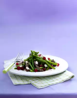 Crumble cheese. Mix beans, currants, cheese and meat and arrange on plates.