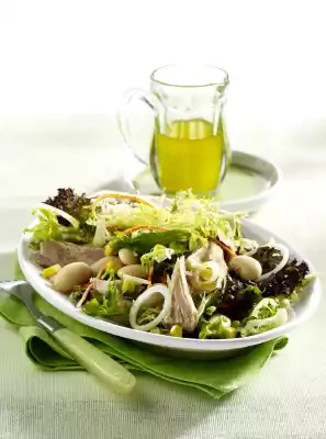 Wash and drain the salad mix. Place the beans, onion rings, tuna and salad mix in a bowl, mix with vinaigrette and arrange on plates.