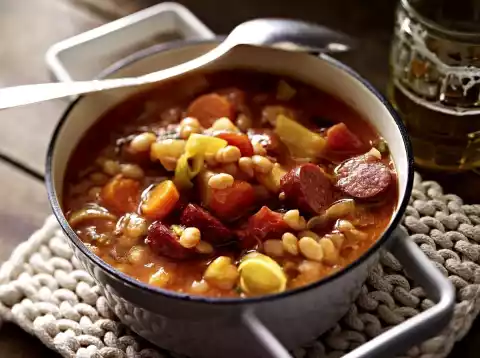 Heat the oil. Fry the mead and onions for about 5 minutes. Add the rest of the vegetables, wine and 3/4 litres of water, bring to the boil and simmer for about 20 minutes. Season with broth. Pour beans into a sieve and rinse with cold water. Add tomatoes and beans to the soup. Chop the tomatoes, bring to the boil and simmer for another 10 minutes