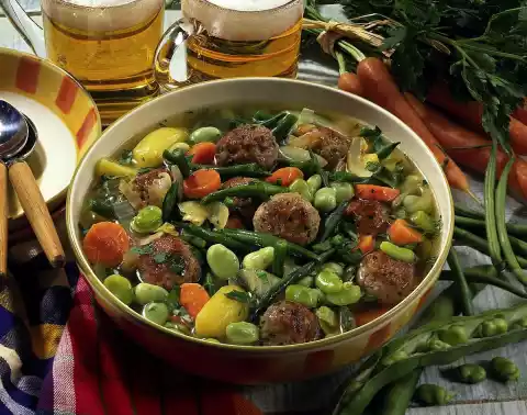 Heat the fat in a large pot, fry the balls while turning them and take them out. Sauté the onions in the hot frying fat until transparent. Add the cleaned vegetables and broad beans, also fry briefly and season with salt and pepper. Bring to the boil, cover and simmer for 20-30 minutes. After about 10 minutes, add the meatballs to the stew and cook them. Season the finished stew with salt and pepper again, place in a bowl and serve sprinkled with remaining herbs