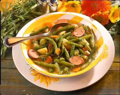 Wash the beans, carrot and potatoes. Break the beans into pieces. Cut carrot into slices and dice potatoes. Wash fresh savory