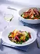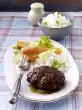 Peel the onions. Chop 1 onion finely. Wash, clean and chop the tomatoes. For the sauce mix vinegar and 1 tbsp. oil and season with sugar, salt and pepper. Mix sauce, onion cubes and tomatoes