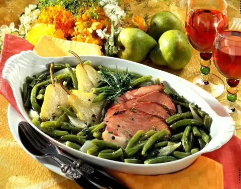 Stir starch in a little cold water until smooth, pour into the pot and thicken the stock slightly. Season to taste with a little salt and pepper. Cut bacon into slices. Finely chop half of the remaining savory. Arrange pears, beans and bacon in a bowl, sprinkle with savory and garnish. Boiled potatoes taste good with it