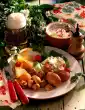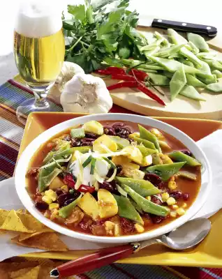 Heat oil in a pot, fry potatoes in it while turning. Add onion and garlic and fry lightly. Add the chilli. Dust with paprika and chilli powder. Deglaze with broth, bring to the boil, add beans and simmer covered for about 12 minutes at medium heat. Add tomatoes, bring to the boil, cover and simmer for another 10 minutes on medium heat. In the meantime, pour the corn into a sieve and drain. Pour kidney beans into a sieve, rinse with cold water and drain well. Add corn and kidney beans, bring to the boil, season well with salt, pepper, paprika, chilli powder, sugar and ketchup.