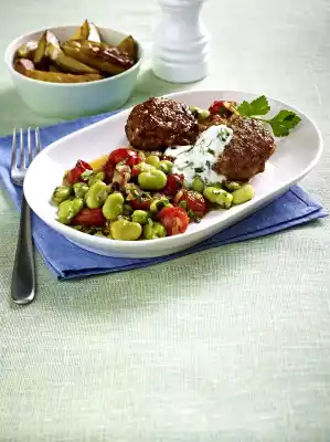 Wash, clean and halve the tomatoes. Wash parsley, shake dry. Pluck off leaves and chop finely, except for something to garnish. Heat 2 tablespoons of oil in a frying pan. Sauté the remaining onions, garlic and beans for 2-3 minutes. Add the tomatoes and cook for another 2 minutes. Season to taste with salt, pepper and sugar. Stir in parsley. Wash mint, dab dry and chop finely. Mix with yoghurt, season with salt and pepper. Take the potatoes out of the oven. Serve the meatballs with bean vegetables and potatoes. Serve with mint yoghurt and garnish with parsley