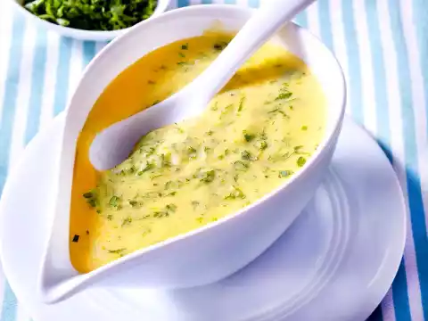 Whisk the egg yolk with the seasoning in a hot water bath with the whisk of the mixer until thick and creamy (the bottom of the bowl must not get too hot, otherwise the egg yolk will stagnate!) Whip the butter first drop by drop, then in a thin stream under the egg mass, so that a creamy sauce is formed.