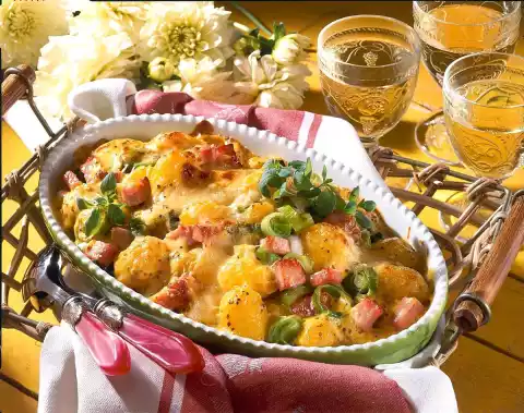 Drain the potatoes, rinse under cold water and peel the skin. Put the potatoes in a greased casserole dish, pour the sauce over them and sprinkle with cheese. Bake in the preheated oven (electric oven: 200 °C/ gas: level 3) for 25-30 minutes.