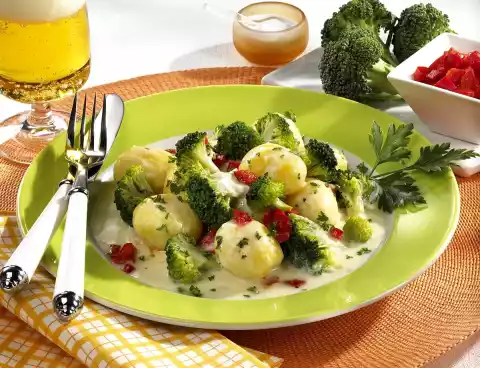 Season to taste with salt, pepper and nutmeg. Add potatoes and broccoli to the sauce. Clean and wash the peppers, cut into fine cubes and add to the béchamel potatoes. Wash the parsley and, except for something to garnish, chop finely and sprinkle over the potatoes.