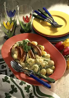 Deglaze with broth and milk and bring to the boil. Season to taste with salt, pepper and sugar. Add potatoes and beans to the bûchamel sauce, fold in and keep warm. Heat oil in a pan and fry the sausages in it until crispy.