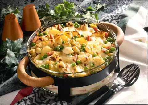 Peel and wash the potatoes and cook them in salted water for about 20 minutes. Clean and wash the cauliflower and divide it into small florets. Cook in boiling salted water for about 8 minutes until al dente. Add peas after 3 minutes cooking time.