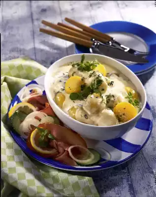 Simmer for about 10 minutes, stirring constantly. Season to taste with salt, pepper and nutmeg. Warm up the potatoes. Stir in half the herbs. Sprinkle with remaining herbs. Cut ham into thin slices. Add onion rings, cucumber slices and lemon to taste.