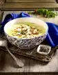 Peel and finely chop the onion. Heat 10 g fat in a pot. Sauté the mushrooms in it and take them out. Heat 40 g fat, sauté onions, add flour and sauté. Deglaze with milk and stock while stirring and bring to the boil.