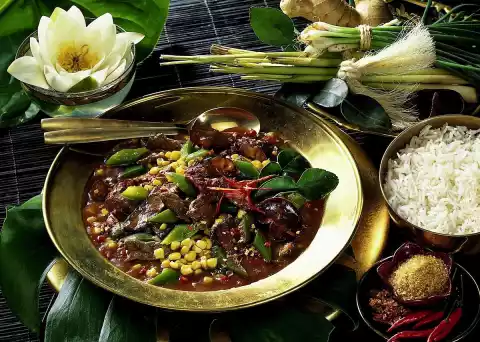 Drain the meat and keep the marinade. Heat oil in a pan. Brown the meat in it for three minutes on all sides. Remove and put aside. Drain the mushrooms, fry in the frying fat with the peppers and corn and deglaze with the marinade. Add beef stock and bring to the boil. Simmer over low heat for ten minutes. Stir cornflour into some water until smooth and thicken the sauce with it. Season the chilli meat with soy sauce, paprika powder and some dried chilli. Serve sprinkled with paprika powder and dried chilli. Garnish as desired with lime or lemon leaves and small red chillies. Basmati rice tastes great with it