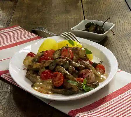 Stir into the sauce. Bring to the boil again and simmer for 1 minute. Add caper apples to the sauce and serve with the potatoes. Garnish with oregano.
