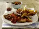 Prepare French fries in the oven according to package instructions. Mix 1 tsp. salt and sweet paprika. Clean, wash and drain the salad. Mix vinegar with mustard, season with salt, pepper and sugar. fold in oil