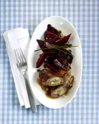 Clean, wash and dice the apple. Place meat between 2 layers of foil and beat flatter. Season with salt and pepper. Spread the meat with horseradish. Sprinkle apple cubes on top, roll up and stick together with a wooden skewer. Heat 1/2 tbsp. oil in a small pan. Fry the rolls for 6-8 minutes while turning, remove and arrange on a plate with beetroot salad. Garnish with chives if necessary.