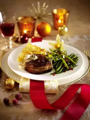 Stir in any sauce thickener, bring to the boil again. Season to taste with salt, pepper and sugar. Remove from the heat and fold in 4 portions of truffle butter, keep warm. Dab meat dry.