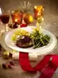 Whip 100 g cream with the whisk of the hand mixer and fold into the sauce. Remove gratin from the oven and cut into pieces. Arrange meat, sauce, beans and a piece of gratin on plates, garnished with marjoram and Cape gooseberry.