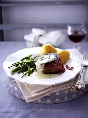 Preheat oven (electric cooker: 80 °C/circulating air: not suitable/gas: see manufacturer). Pat the steaks dry and wrap each with 1 slice of bacon. Tie with kitchen string. Heat lard in a pan. Sauté the steaks in it for about 1 minute on each side. Season with salt and pepper. Roast in the oven for about 1 hour. Keep the pan with the frying set.