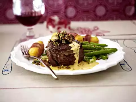 Heat 4 tablespoons of oil and fry the croquettes in it until golden brown, turning them over, keep warm. Dab beef fillet dry and cut into 4 medallions. Heat clarified butter in a large pan. Sauté the steaks in it for about 1 minute on each side, season with salt and pepper. Fry over medium heat for about 4 minutes, turning. Wrap the steaks in foil and let them rest for about 5 minutes