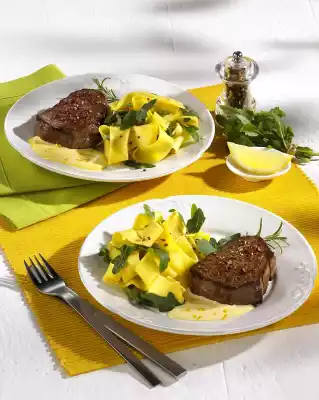 Season with salt and pepper. Heat oil in a large pan, fry steaks for 3-4 minutes on each side, remove and season with salt. Drain the noodles and mix with the rocket. Arrange noodles, sauce and steaks on plates.