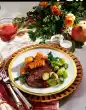 Sprinkle steaks with coloured pepper. Garnish with rosemary sprigs.