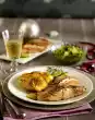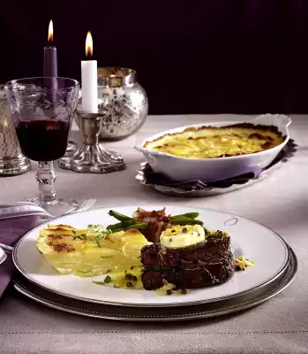 Fry the bean packets all around in hot frying fat. Wrap the butter around the beans and cut into slices. Arrange medallions with butter, bean packets and gratin, garnish with thyme. Sprinkle remaining orange peel on the butter