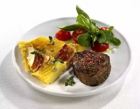 Mix milk, cream, egg, thyme and half the onion. Season well with salt, pepper and nutmeg. Drain the potatoes and layer them together with the apple wedges in a small, greased gratin dish (18-20 cm Ø). Pour egg milk over it and bake in the preheated oven (electric cooker: 200 °C/ convection oven: 175 °C/ gas: level 3) for 35-40 minutes. In the meantime, wash and drain the tomatoes and cut them in half. Clean the lamb's lettuce, wash thoroughly several times and also drain. Mix vinegar, some salt, pepper and the remaining onions and finally add 2 tablespoons of oil. Coarsely crush colored pepper and turn the steaks in it. Heat 2 tablespoons of oil in a coated pan and fry the steaks for 3-4 minutes, turning them over. Salt the steaks, wrap them in aluminium foil and let them rest for 2-3 minutes. In the meantime, mix tomatoes, lamb's lettuce and vinaigrette.