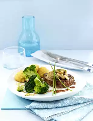Wash the meat, dab dry and season with salt. Remove the broccoli and rinse with cold water. Heat the oil in an ovenproof pan and fry the meat for about 4 minutes on each side. Spread the crust on the meat and bake in a preheated oven (electric range: 225 °C/ convection oven: 200 °C/ gas: level 4) for approx. 5 minutes.