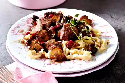 Add the mushrooms and cranberries to the goulash about 5 minutes before the end of the cooking time and braise them. Season goulash to taste. Serve with the spaetzle.