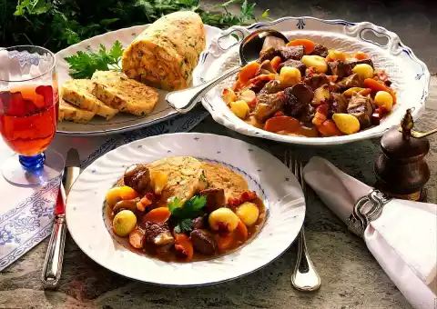 Season goulash with salt, pepper and paprika. Serve with the napkin dumpling.