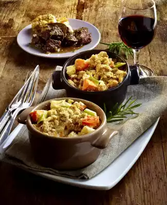 Spread the crumbles evenly. Bake in the preheated oven (electric cooker: 200 °C/ convection oven: 175 °C/ gas: see manufacturer) for 30-35 minutes. Season to taste with salt and pepper and arrange on plates with winter vegetables.