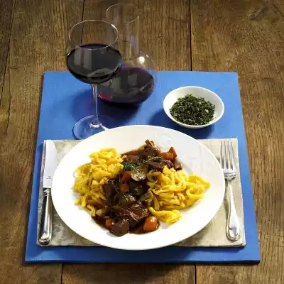If the sauce gets too thick, add some water. After about 1 1/2 hours, peel the carrots and cut into cubes of about 1.5 cm. Clean, clean and quarter the mushrooms. First add the carrots to the meat, about 10 minutes later the mushrooms. Wash the parsley, dab dry and chop the leaves finely. Heat the butter in a pan and fry the spaetzle in it. Season with salt and a little nutmeg. Serve the meat with the spaetzle and sprinkle with crisp bacon and parsley