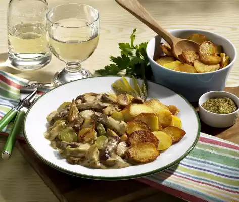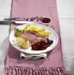 Refine with mustard and cream, season again. Cut the remaining gherkins in a fan shape. Arrange roast potatoes and Boeuf Stroganoff on plates, garnish with gherkin fans.