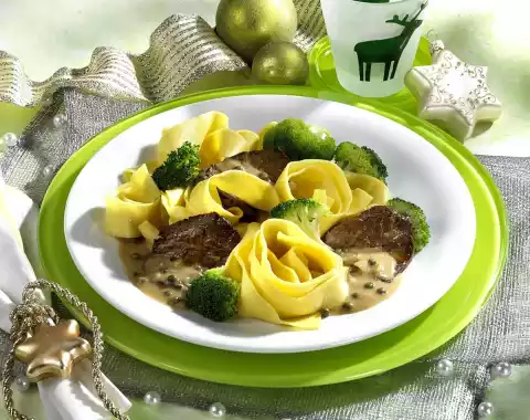 Drain the broccoli and collect the cooking water. Sauté diced onions in hot frying fat. Add cooking water and peppercorns, bring to the boil and thicken. Stir in cream and season with salt and pepper. Drain the noodles. Serve everything