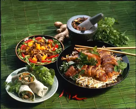 Peel and finely chop the garlic. Cut off the fat from the rump steaks and cut the steaks crosswise into thin slices. Mix sugar, starch, 4 tablespoons of fish sauce and half the garlic.