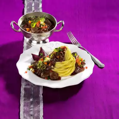 Wash the beef fillet, dab dry and cut into cubes. Heat oil in a pan. Brown the meat in it all around. Season with salt and pepper. Take out. Roast the prepared vegetables in hot frying fat. Add onions and garlic and fry briefly. Season with salt, pepper and thyme. Stir in tomato paste and add red wine and vegetable stock. Add meat, bring to the boil and simmer covered for 10 minutes. Meanwhile cook pasta according to package instructions. Wash tomato, rub dry, cut out seeds and finely dice the flesh.