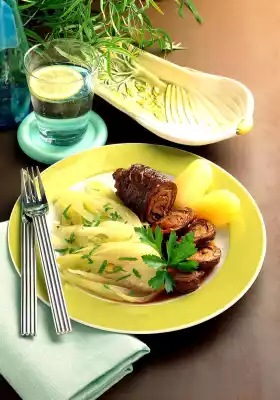Season to taste with salt, pepper and paprika. Wash the parsley and cut into fine strips, except for a few leaves for garnishing. Arrange roulades with sauce, potatoes and fennel vegetables sprinkled with parsley.