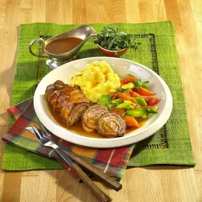 Roll up tightly, wrap overhanging bacon strips around the roulade, pin them tight with wooden skewers. Heat lard in a roaster. Fry the roulades in it until they are well done. Add the remaining onion and fry briefly. Season roulades with salt and pepper. Deglaze with 750 ml water. Bring to the boil, stir in stock. Cover and stew for about 1 1/2 hours. Meanwhile peel, wash and cut potatoes into pieces. Cook in boiling salted water for about 20 minutes. Clean, peel and wash carrots. Cut lengthwise in half and cut into pieces. Cut remaining leek into rings. Heat 1 tablespoon of butter, fry carrots and leek in it. Add 1/2 teaspoon marjoram, add 250 ml water and simmer over a high heat until the water has almost evaporated. Sprinkle with sugar and caramelise briefly while stirring. Season to taste with salt and pepper. Heat up milk and 1 tablespoon butter.