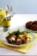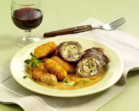 Remove the roulades from the stock and keep warm. Reduce stock to a creamy consistency for about 10 minutes. Prepare croquettes in the oven according to package instructions. Add the rest of the cream cheese mixture, spring onion and diced peppers to the roulade stock. Arrange roulades, croquettes and sauce on preheated plates. Garnish with marjoram stems