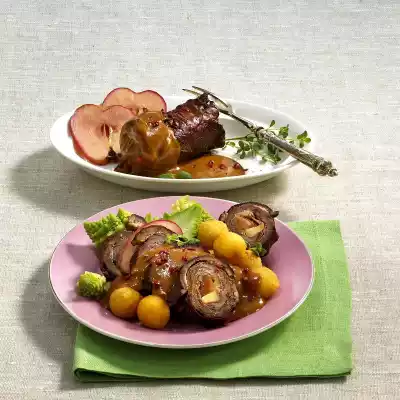 Deglaze with cider and stock, add cinnamon and cloves and bring to the boil. Cover and stew for about 1 hour. In the meantime, spread the potato balls on a baking tray and bake in a preheated oven (electric cooker: 200 °C/ convection oven: 175 °C/ gas: level 3) for 20-24 minutes. Clean the Romanesco, divide into florets, wash and drain. Cook in boiling salted water for 10 minutes. Wash the rest of the apple, grate dry, cut into slices and sprinkle with lemon juice. Heat the fat in a pot and fry the apple slices until soft. Add Romanesco and toss. Keep warm. Remove the finished roulades from the steaming stock. Stir the starch with cold water until smooth. Stir into the stock, bring to the boil briefly and season to taste with salt, pepper and a little sugar.