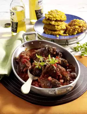 Heat 2 tablespoons of oil in a frying pan. Sauté the roulades in it. Deglaze with beer and chunky tomatoes, bring to the boil. Add dried oregano and braise for about 1 1/4 hours. If necessary add some more water.