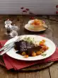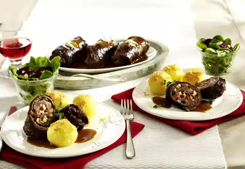 Season vinegar with salt, pepper and sugar, fold in oil. Arrange the salad in small bowls, add the marinade. Add onion. Remove the roulades from the roaster. Bring the sauce in the roaster to the boil again.