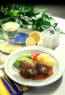 Add the stock. Cover and let it stew for about 1 hour. Cook potatoes in salted water for about 20 minutes. Steam leek in a little salted water for about 10 minutes. Remove the roulades and keep warm. Stir the rest of the tomato paste into the sauce. Stir in the sauce thickener and bring to the boil. Season to taste with salt and pepper. Drain, rinse and peel the potatoes. Drain the leek. Arrange everything on plates and garnish with tomato wedges