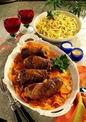20 minutes before the end of the cooking time, sauté the onions in the remaining fat, add the carrots, cover and cook over a mild heat for about 15 minutes. Season with salt and coarse pepper. Remove the roulades from the stock and keep warm.